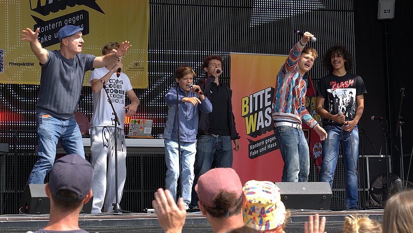 Mit Engagement und einer klaren Botschaft gegen Fake und Hass beeindruckten 30 Kinder und Jugendliche aus Baden-Württemberg am 27. Juli 2025 das Publikum auf der Feldbühne des Open-Air-Festivals DAS FEST in Karlsruhe. Im Rahmen der Kampagne BITTE WAS?! – Kontern gegen Fake und Hass präsentierten sie selbst verfasste Songs und setzten damit ein deutliches Zeichen für Toleranz, Respekt und ein wertschätzendes Miteinander.