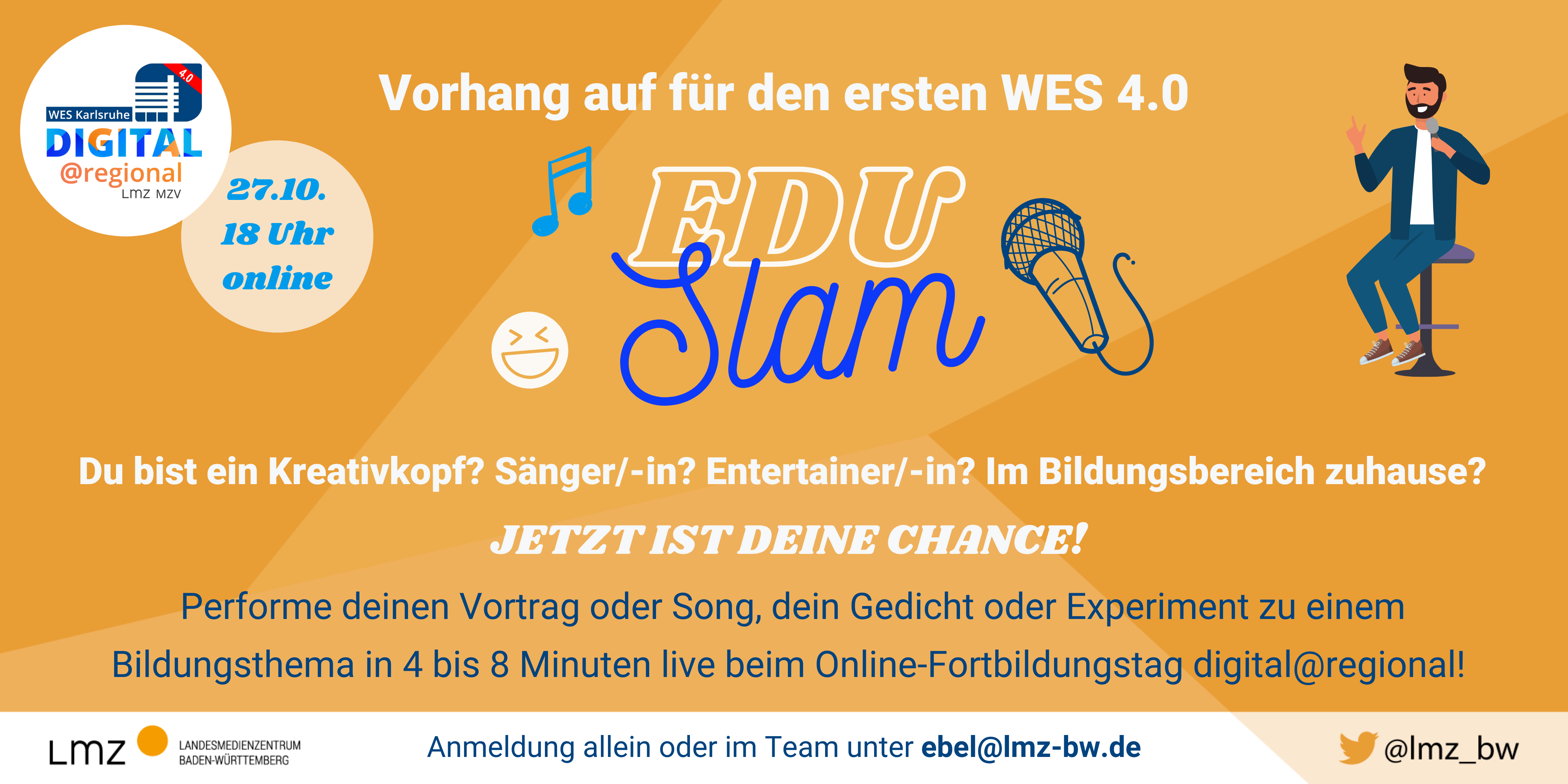 Beim dazugehörigen digital@regional-Stammtisch #EduSlam, der am Abend des ersten Fortbildungstages, am 27. Oktober, stattfindet, haben alle Kreativköpfe und Entertainer/-innen die Möglichkeit im Rampemlicht zu stehen und von Teilnehmenden bejubelt zu werden. Außerdem dient der Abend zum informellen Austausch und Netzwerken.