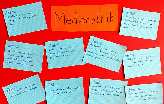 Das Thema „Medienethik“ war nicht einfach, aber es ist uns gelungen, über ein paar einfache Regeln ins Gespräch zu kommen und abstrakte Regeln mit Leben zu füllen. Wir werden unser Plakat gut sichtbar aufhängen und immer weiter mit Beispielen füllen. Mein Fazit: Praxisnahe Medienethik funktioniert nur als Entwicklungsprozess. Ein weiterer „Medienkompetenztag“ geht zu Ende. Doch mein Lieblingsgebot lautet weiterhin: Einfach mal abschalten!