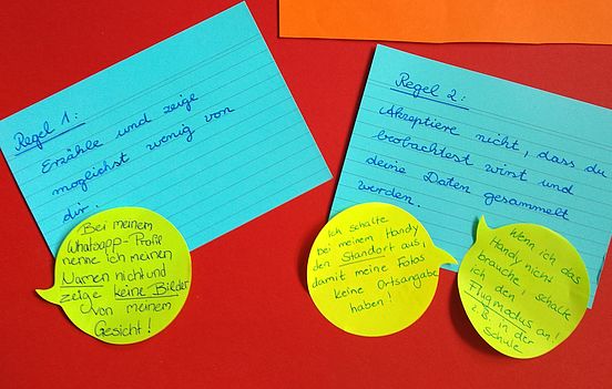 Doch es bleibt eine Frage offen: Wie sollen sich jetzt meine beiden Nachwuchs-Medienpädagogen die Regeln merken? Am besten gelingt dies anhand praktischer Beispiele, die sie aus eigener Erfahrung kennen. Zu jeder Regel sollen sie ein Beispiel (er-)finden und Verhaltensvorschläge formulieren. Um die Beispiele visuell festzuhalten, schlage ich vor, unser persönliches Medienethik-Plakat gestalten. Schnell haben meine beiden Kinder erste Ideen, wie man die Regeln in die Praxis umsetzen kann.