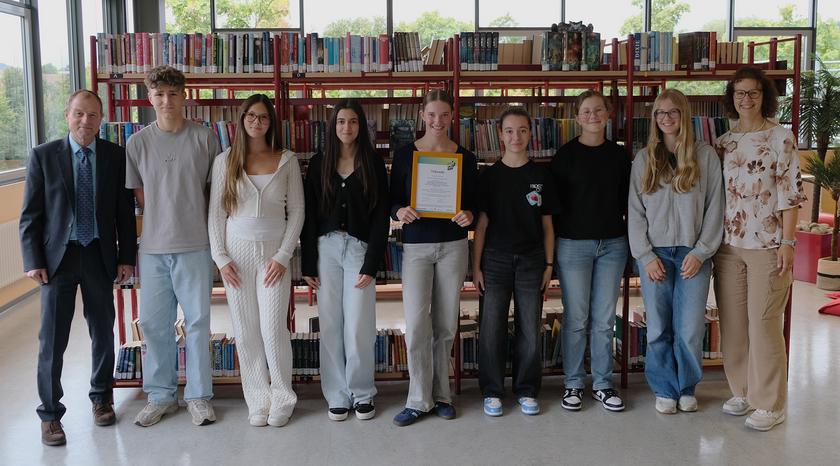 Schülermedienmentorinnen und -mentoren des Auguste-Pattberg-Gymnasiums, Mosbach, gemeinsam mit der Schulleitung, Dr. Thomas Pauer, und der Lehrkraft, Sandra Schoder.