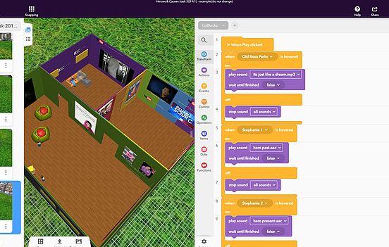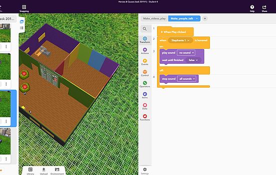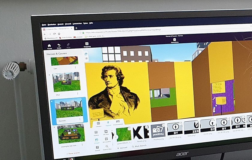 So sollten Fotos und Videos importiert und die geschriebenen Texte eingesprochen werden. Schließlich sollten Objekte anhand von ebenfalls bereits vorbereiteten Elementen so programmiert werden, dass die eingesprochenen Texte und Videos durch einen Mausklick abgespielt werden können, indem man mit dem Mauszeiger darüber hovert. Als die Räume fertig erstellt waren, hatten die Lernenden aus beiden Ländern die Möglichkeit, ihr eigenes Museum zu ihren zwei Helden und dem guten Zweck selbst mit einem Tablet oder einer Oculus Go virtuell zu erkunden.