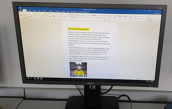 Schließlich sollten sich die Lernenden eine Sache überlegen, die ihnen am Herzen liegt, und durch die sie vielleicht selbst eines Tages zum Helden bzw. zur Heldin werden könnten. Als Beispiel wurde hier Klimaschutz genannt und an Greta Thunberg erinnert. Auch hier war die Aufgabe, einen kurzen Text in der Fremdsprache zu schreiben, der ihr Anliegen erläutert, und Illustrationsmaterial zu beschaffen.