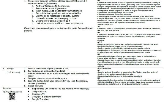Die Projektpartner arbeiteten in der Regel in gemischten binationalen Vierergruppen zusammen. Als Abschluss erhielten sie den Auftrag, den Museen der anderen drei Gruppenmitglieder virtuell einen Besuch abzustatten und diese zu erkunden. Schließlich sollten sie (am PC bzw. am Tablet) eine Figur im Feedback-Corner der drei besuchten Museen platzieren, die mündlich auf Englisch ein Feedback gibt und eine Frage stellt. Jeder Jugendliche besuchte dann erneut sein eigenes Museum, beantwortete die Fragen der Besucher ebenfalls in der Fremdsprache und konnte sich am Ende die Antworten auf seine Fragen bei einer erneuten virtuellen Stippvisite anhören.