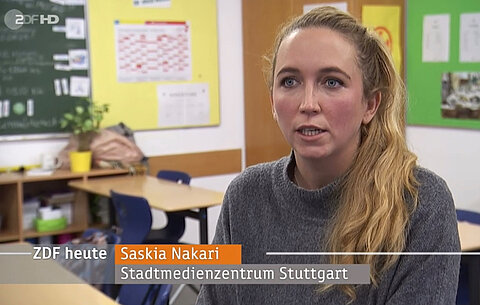 Saskia Nakari erklärt, wie präventive Maßnahmen in Form von Workshops an den Schulen helfen können. Die Medienpädagogin des Stadtmedienzentrums Stuttgart zeigt dies direkt vor Ort.